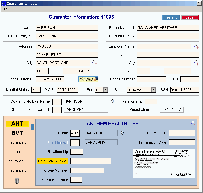 Use the Guarantor Window to verify and edit guarantor demographic and insurance information.  The table following the window example describes the Guarantor Window of Patient Entry.