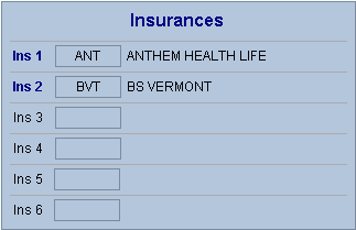 Displays the Insurance Codes assigned to the patient. Tip: Patient insurance information is assigned at the Patient Entry - Insurance Window. |