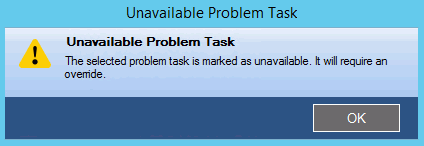 An appointment will need an override if the assigned problem/task is unavailable, or if the appointment duration conflicts with existing appointments. If an appointment meets override criteria, then an Override prompt displays to alert you. To remedy, you can change the problem/task or duration. Or, you can choose to override, by clicking Ok. If you choose to override for the appointment the problem/task or the duration that overlaps will be used. An override icon is included in the appointment to alert you. |