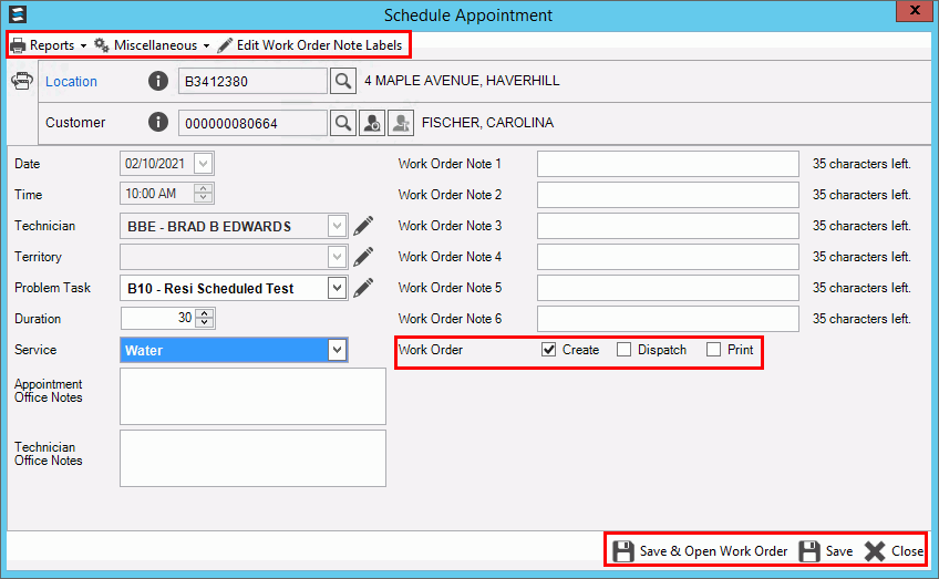 Enter optional work order notes related to the appointment, if desired. (up to 35 characters per line, 6 lines) Tip: Because the Work Order Notes field names can be changed to suit your needs, your field labels may not match the documentation. You can edit the field labels by clicking Edit Work Order Field Labels. |