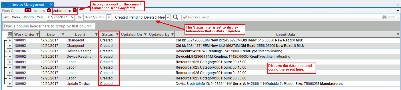 Use the Automation tab on the Service Management view to see Mobile Work Order Automation events. These Automation Events can be updated and processed manually here as well. Mobile Work Order Automation allows EDIFICE to automatically perform certain operations using data from completed mobile work orders. When a completed work order is sent back to EDIFICE the event is performed. There are several types of available automations. In addition, certain other information is automatically updated from mobile work orders and not through an Automation event.