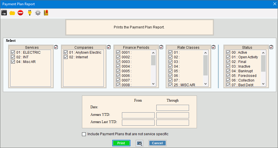 To limit the report to a range of customers with a number of arrears that is less than or equal to the Through Arrears YTD, enter the appropriate ending number of Arrears YTD. Tip: To include all customers, leave blank. |