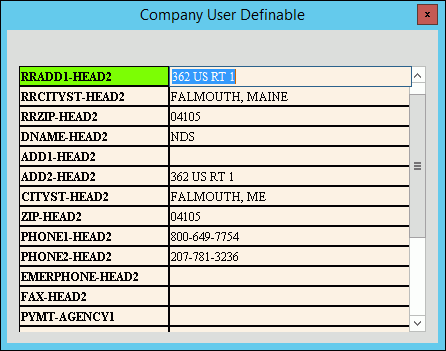 Use Company Settings Maintenance - User Definable Window to maintain information for the company user definable fields. The company user definable fields are free-form fields that you can define for your specific purposes. The user definable fields are informational only and can be included in an XML stream if desired. For example, you can use the user definable fields to maintain company information such as a mailing address to be printed on bills or customer letters. The table following the window example describes the Company Settings Maintenance - User Definable Window.