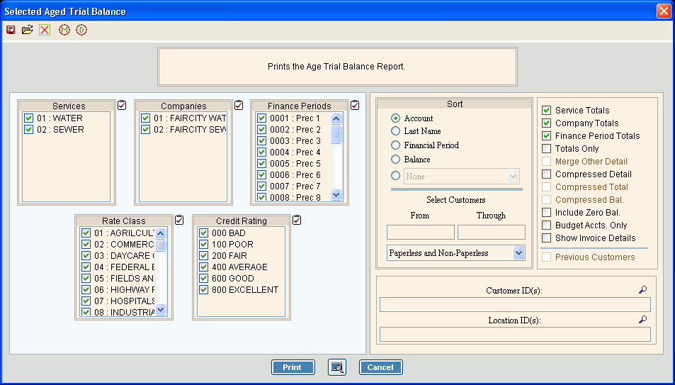 Use the Aged Trial Balance Report to provide a snapshot of your accounts receivables. This report lists customer accounts receivable balances for each service and can provide a breakdown of their respective aging buckets and their finance charges, if applicable. This report has the option to print the associated invoice detail for open item customers. The Customer History Report also provides invoice detail information. You can tailor the report using a variety of criteria including sort options, subtotal options and selection by Account range. You can also choose to list totals only while excluding the customer aging buckets detail.