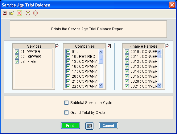 Use the Service Trial Balance Report to provide a snapshot of your accounts receivable for each service. This report provides a breakdown of the Aging Balances, as well as, Finance Charge amounts for each service and each Cycle, if applicable.