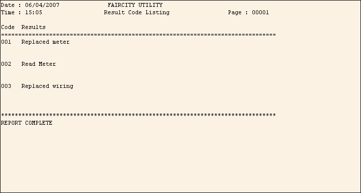 The Results Code Listing reports the defined Result Codes and the Descriptions that identify the resolution of the tasks and problems that require customers to call for service.