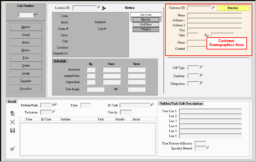 Service Call Entry - Customer Demographics Area Prompts Tip: To see more information about a field, click the hyperlink for the field name. |
