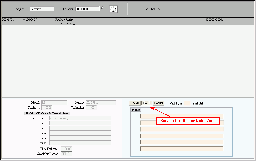 Service Call History Inquiry - Service Call History Notes Area Example: