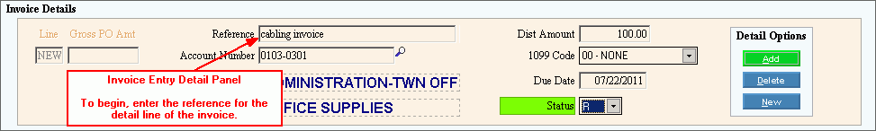 To complete the invoice detail line, click Add or press [ENTER]. Keyboard shortcut: [ALT + a] Note: If additional detail needs to be entered to complete the invoice distribution amount, the New button becomes active. Press [ENTER] or click New to begin entered the new invoice detail line. |