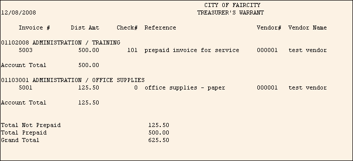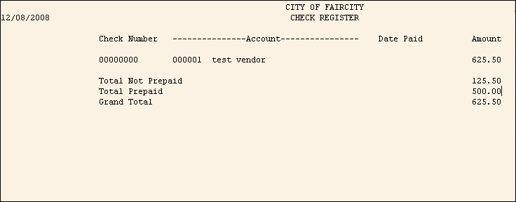 Accumulated dollar amount of all checks that were prepaid Tip: All prepaid checks print first with the accumulated prepaid dollar amount printing at the end of the prepaid checks. |