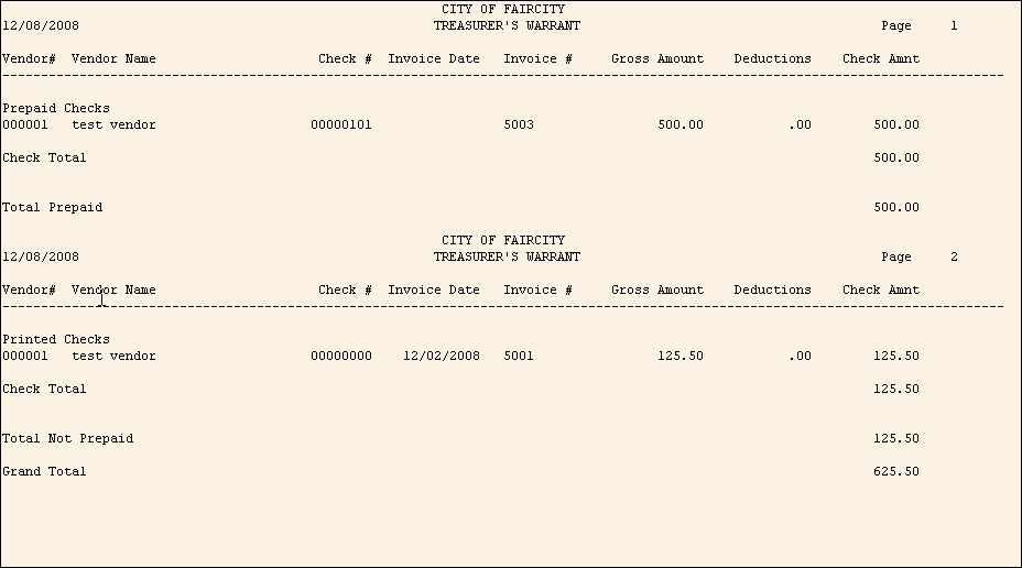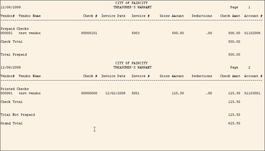 Accumulated dollar amount of all checks processed during the A/P check run Tip: The Grand Total dollar amount should equal the Total Not Prepaid amount and the Total Prepaid amount. |