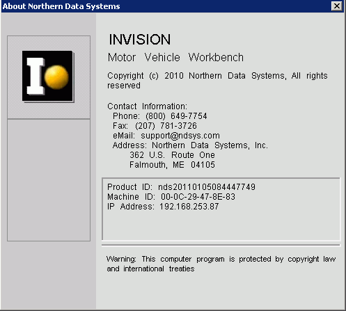 The About window displays your current version of Invision Motor Vehicle Registration Workbench and contact information.