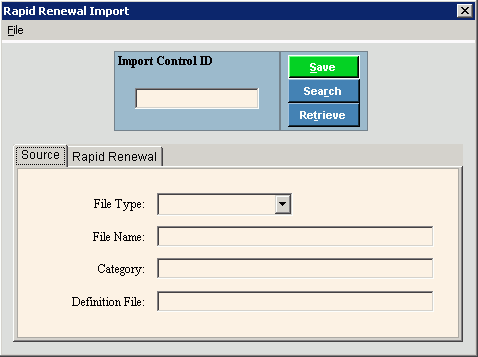 Use Rapid Renewal Receipts Import Control Maintenance to maintain the physical attributes of the import work file containing rapid renewal information. This information is used during the Rapid Renewal Receipts Import routines. The control information includes the file type, the file name, and the definition file name.