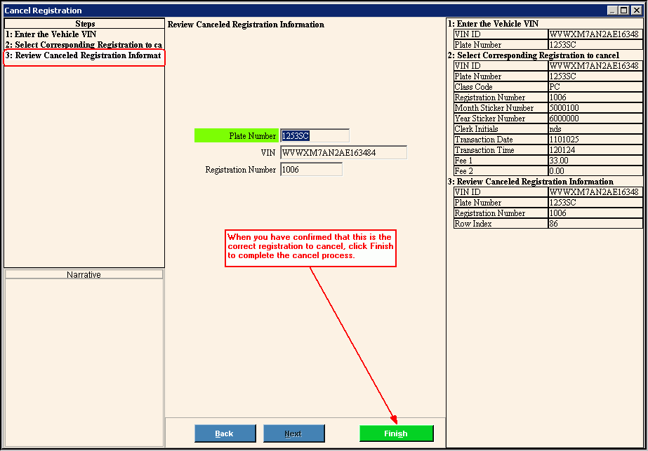 If this is the correct registration to cancel, click Finish. The registration is canceled and the wizard window closes when the save is complete. Keyboard shortcut: [ALT + s]