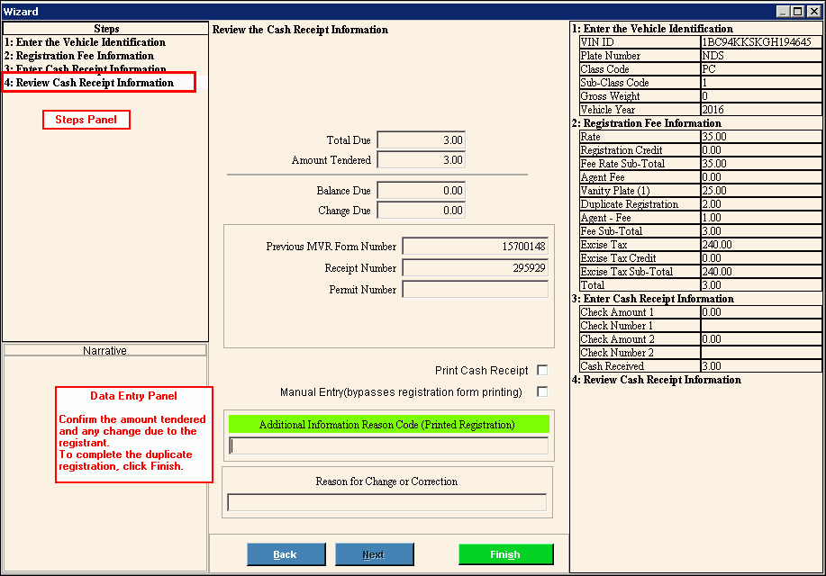Use the Duplicate Registration Wizard Step to review and confirm the payment amount tendered and any change due, as well as, verify the receipt number of the registration form. After entering all appropriate information and clicking Finish, the duplicate vehicle registration form prints as the final step in the duplicate registration process. The table following the panel example describes the data entry for this step in the Duplicate Registration Wizard.
