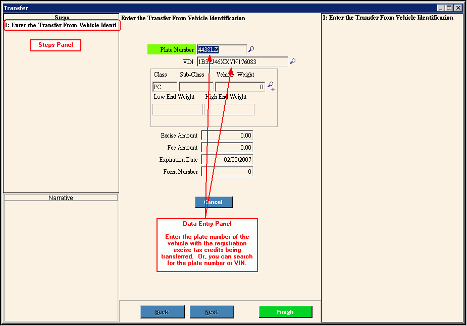 Data Entry Panel - Enter Transfer From Vehicle Identification Step Example: