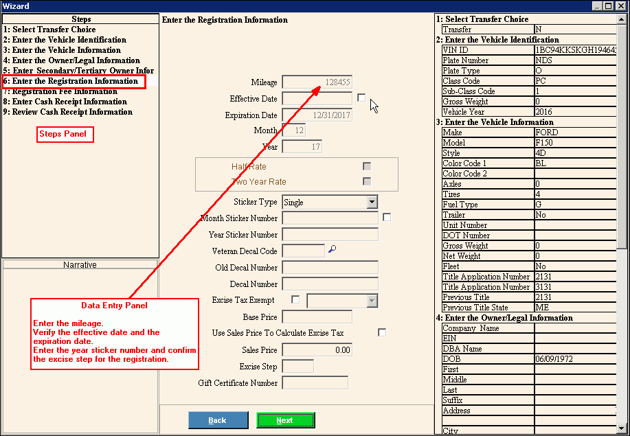 Use the Enter Registration Information Step to enter the re-registration information including the mileage and the year sticker number and then, confirm the excise step. The table following the panel example describes the data entry for this step in the Re-Registration Wizard.