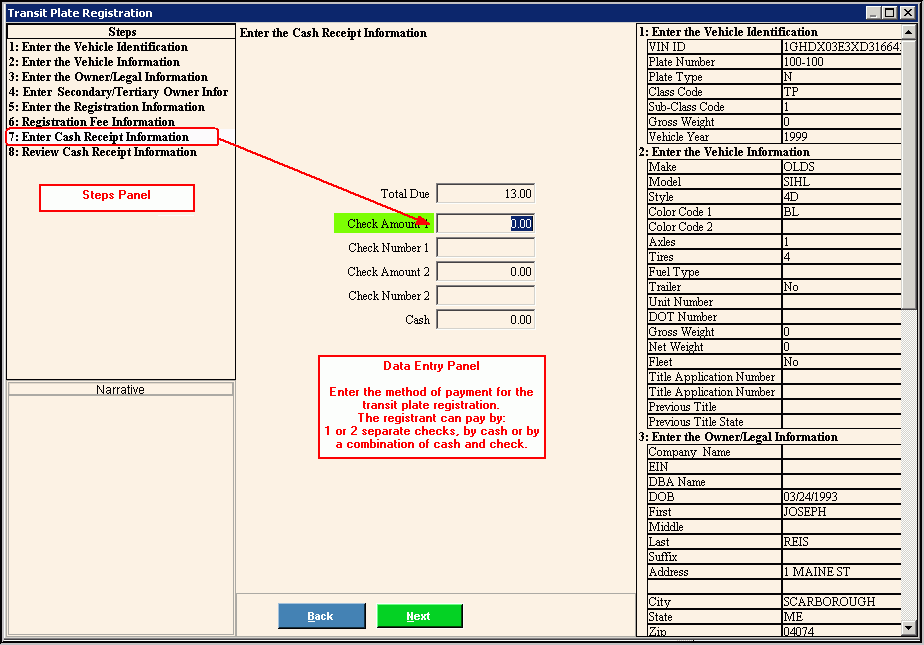 Use the Enter Cash Receipt Information Step to enter the method of payment and the amount of the payment for the transit plate registration. The registrant can pay by a single check or two checks, by cash or by a combination of one or two checks and cash. The table following the panel example describes the data entry for this step in the Transit Plate Registration Wizard.