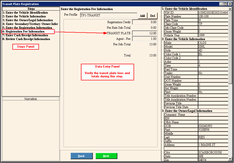 Transit Plate Registration Wizard - Enter Registration Fee Information Step