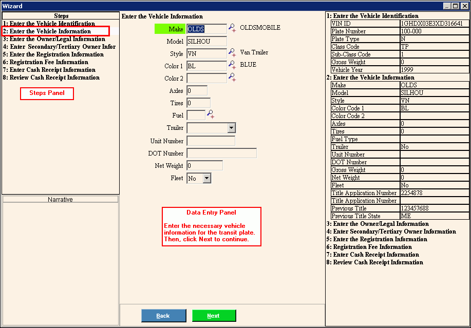 Data Entry Panel - Enter Vehicle Information Step Example: