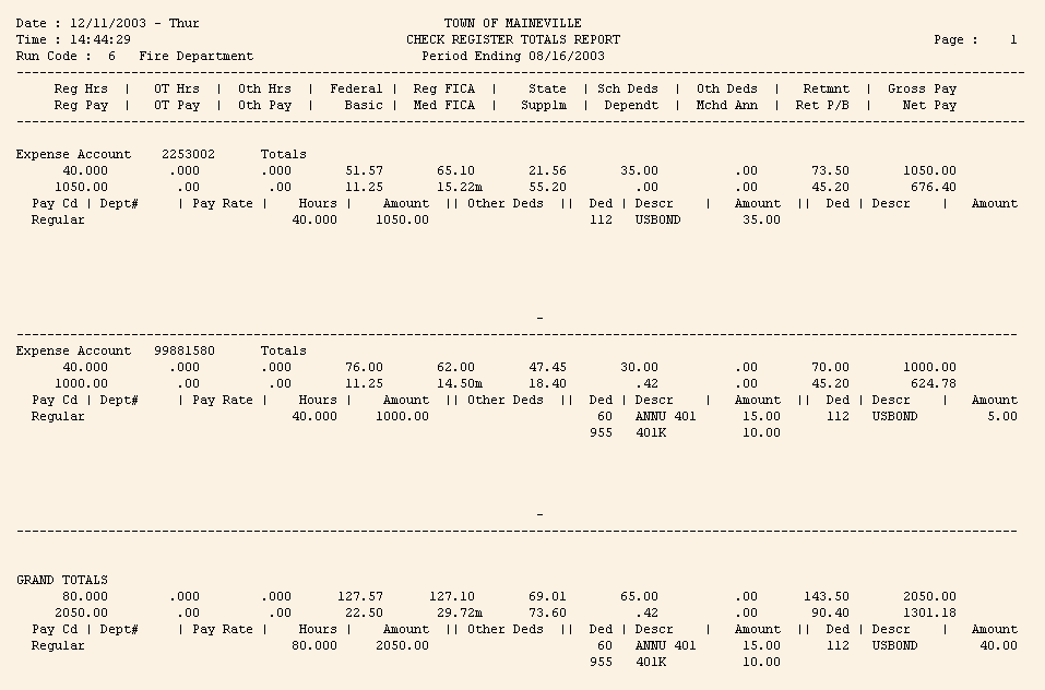 Deduction Lines Tip: The following totals print for each department. A separate line prints for each Deduction Code applicable to the employee (in multiple columns if necessary). | |