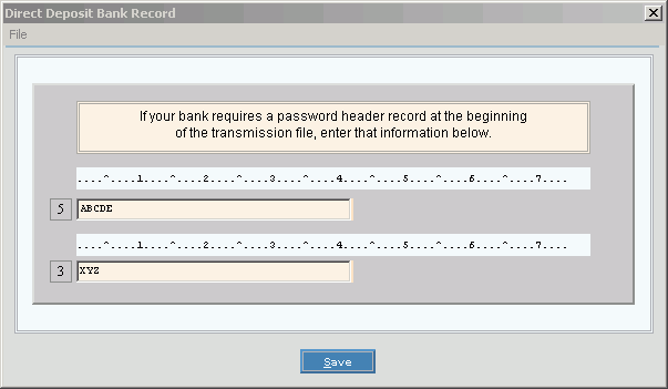 Enter the second line of the password header according to instructions from your bank or financial institution. (up to 74 characters) Note: The text must not start with 1, because that value is reserved as a special record type for the batch header record. | |