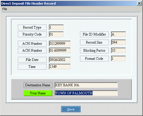 If the File Header Record does not exist, the program automatically prompts for a new record. Simply fill in the data and click Save.