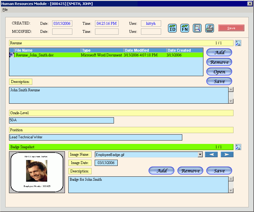 Use the Human Resources Area in Employee Master Maintenance to enter user-defined HR notes about the employee or to attach files and images to the employee. The table following the window example describes the Human Resources Area.