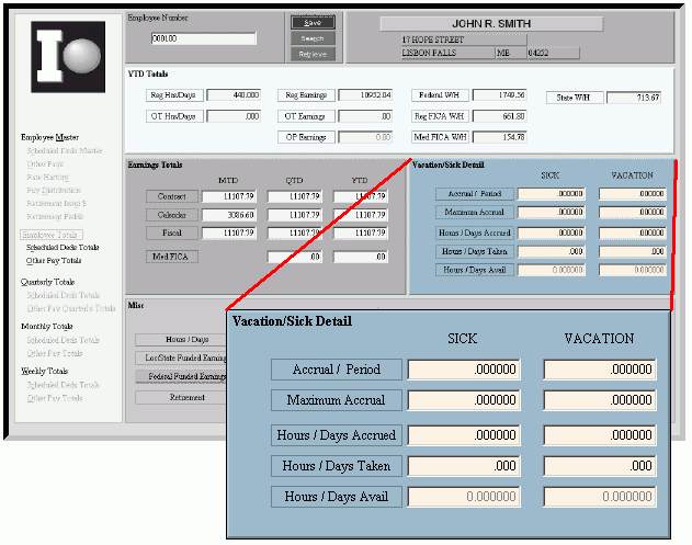 Employee Totals Master Maintenance - Vacation/Sick Detail Area Example: