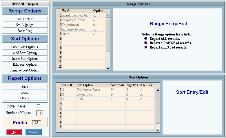At the Report Writer window, you can change the selection and sort options for the report. For more information, refer to the Report Writer Overview.