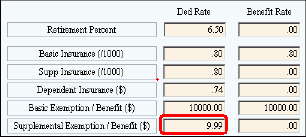 The Ret-ME Supplemental Ins Ex Mult/Amount for Ded is used to calculate the starting point for when the employee's portion of the MainePERS supplemental life insurance premium deduction kicks in. Unlike the basic exemption which is always a flat amount, the supplemental exemption can contain either a multiplier value or a flat exemption amount.