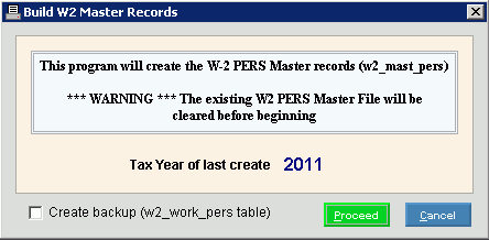 Do not confuse Build W-2 PERS Master Records with Build W-2 Master Records. While they look very similar, they are two separate routines and have separate functions.