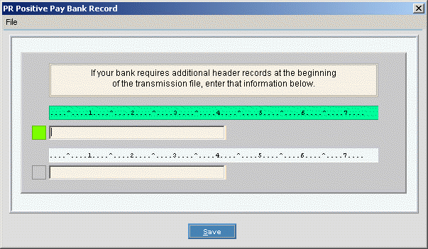 Use Positive Pay Bank Record Maintenance to maintain the bank header record for the Positive Pay transmission file. The Positive Pay system transfers files to your bank to detect possible check fraud.