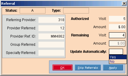 Tip: The Referral Authorization window does not display unless you are set up to automatically pull in the referral data.