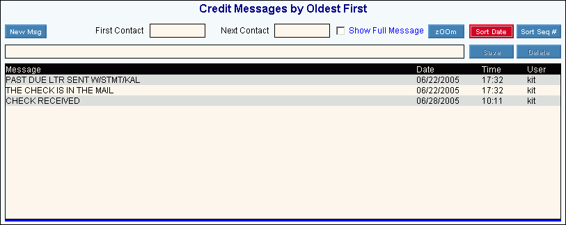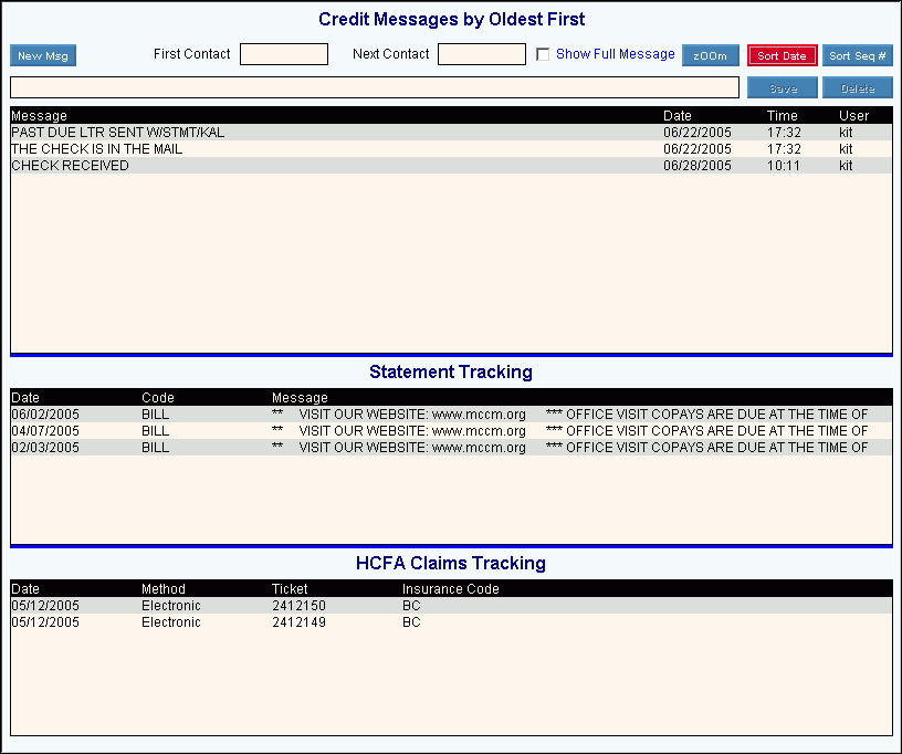 Use the Patient Entry - Credit Messages Window to maintain information about all correspondence and phone conversations between your practice and your patients. This includes recall letters, correspondence generated by INSight's Patient Letter Writer, phone conversations, HCFA claims and patient statements.