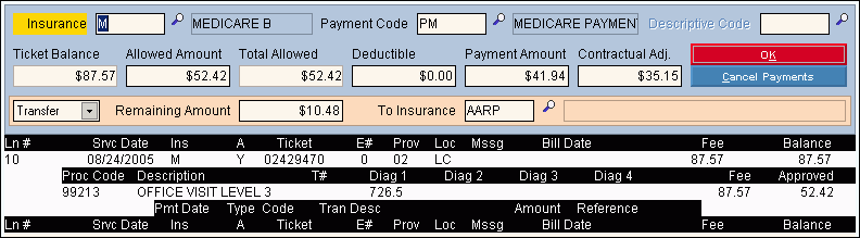 In the following examples, the ticket to be paid is assigned to Medicare B, the primary insurer for the patient. The secondary insurer assigned to the patient is AARP.