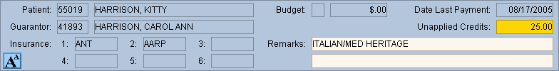 Use the Patient Guarantor Area in the Work Window to quickly view patient guarantor information, their assigned insurances, budget information and the date of their last payment. The table following the window example describes the Patient Guarantor Area in Payment Entry.