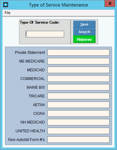 Use Type of Service Maintenance to maintain information about Type of Service codes. You can use Type of Service codes to group procedures together based on the type of care or service the procedure provides. For example, Medicare usually assigns Type of Service code 01 as General Medical Care. During Procedure Maintenance Procedures codes that are classified as General Medical Care are assigned Type of Service code 01. Insurance companies frequently determine what the Type of Service codes should be.