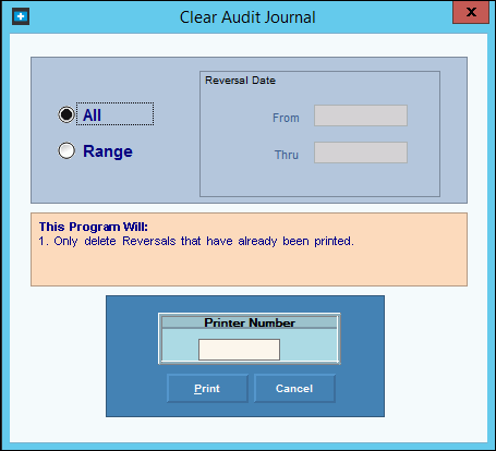 Although you can print selected parts of the Audit Journal by limiting reversal dates and choosing not to include all Batch numbers, you cannot clear the journal file unless you have printed all reversal dates you choose to clear.
